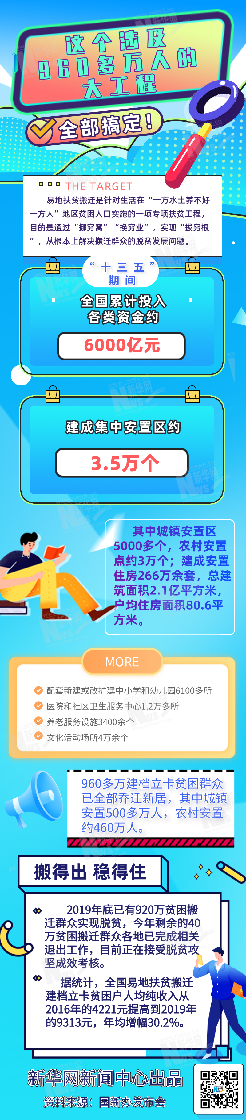 新華網(wǎng)北京12月3日電(汪亞)國務(wù)院新聞辦公室于今日舉行新聞發(fā)布會,介紹易地扶貧搬遷工作情況。國家發(fā)展改革委秘書長趙辰昕在發(fā)布會透露,“十三五”期間,全國累計(jì)投入各類資金約6000億元,建成集中安置區(qū)約3.5萬個,960多萬建檔立卡貧困群眾已全部喬遷新居,其中城鎮(zhèn)安置500多萬人,農(nóng)村安置約460萬人。