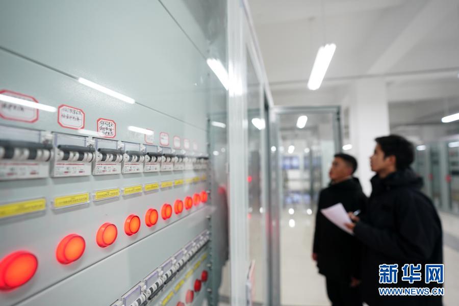 在西藏阿里與藏中電網(wǎng)聯(lián)網(wǎng)工程薩嘎220千伏變電站,工作人員查看設(shè)備運(yùn)行情況(11月27日攝)。新華社記者 詹彥 攝