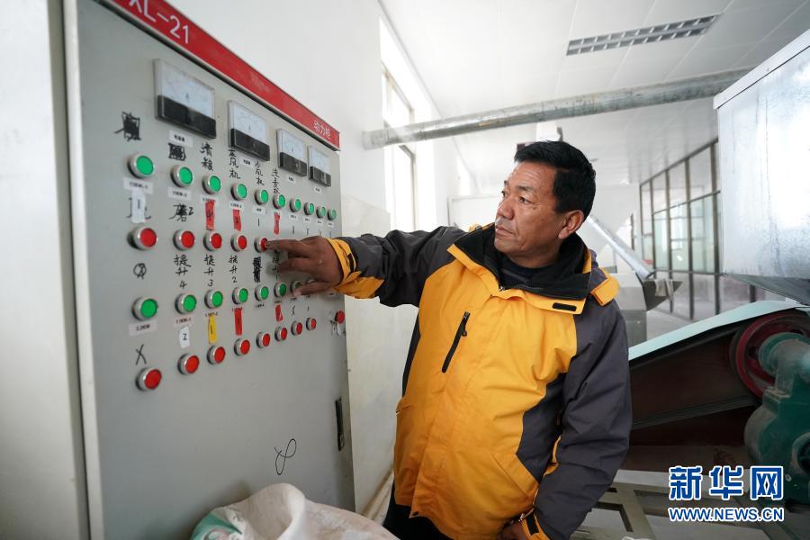 在西藏阿里地區(qū)普蘭縣普蘭西德稞原地食品有限公司,工作人員在糌粑加工車間查看設(shè)備運(yùn)行情況(11月28日攝)。新華社記者 詹彥 攝