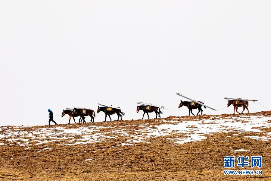 在西藏日喀則市拉孜縣與定日縣交界處的嘉措拉山上,施工人員用騾子向施工點(diǎn)運(yùn)送材料(4月25日攝)。新華社發(fā)