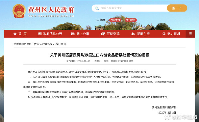 湖北省黃岡市黃州區(qū)人民政府網(wǎng)站12日發(fā)布通報(bào),撤銷對(duì)網(wǎng)購(gòu)涉疫進(jìn)口冷鏈?zhǔn)称穫€(gè)人所作的行政處罰,包括200元罰款。 ????