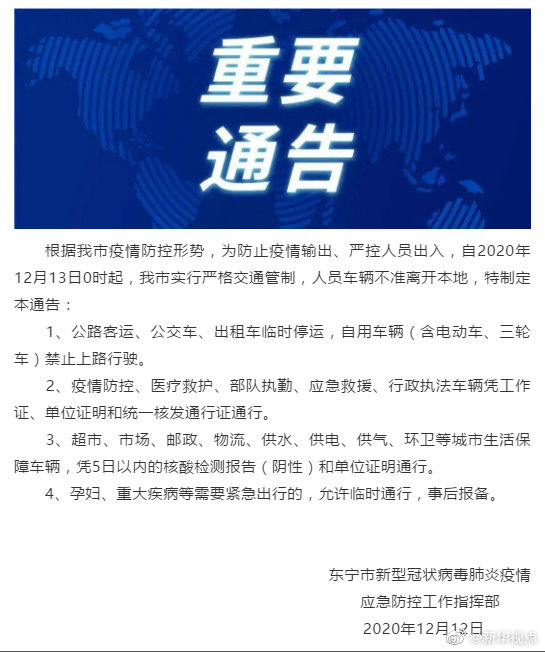 黑龍江東寧市新型冠狀病毒肺炎疫情應急防控工作指揮部消息:根據(jù)東寧市疫情防控形勢,為防止疫情輸出、嚴控人員出入,自2020年12月13日0時起,東寧市實行嚴格交通管制,人員車輛不準離開本地。