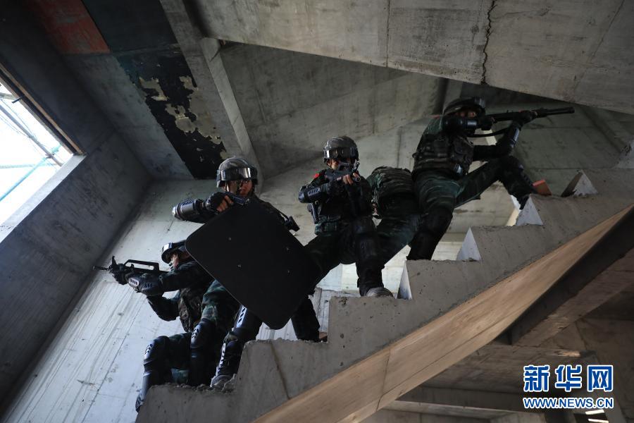 武警新疆總隊(duì)某機(jī)動(dòng)支隊(duì)特戰(zhàn)一中隊(duì)開展模擬街區(qū)捕殲演練(9月20日攝)。新華社發(fā) (張文 攝)