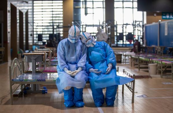 3月10日,武漢武昌方艙醫(yī)院休艙,劉海婷和許國娟自愿報名去做最后的消殺工作,在等待出艙的時候,她們覺得有點累,便坐下來休息了一會兒。