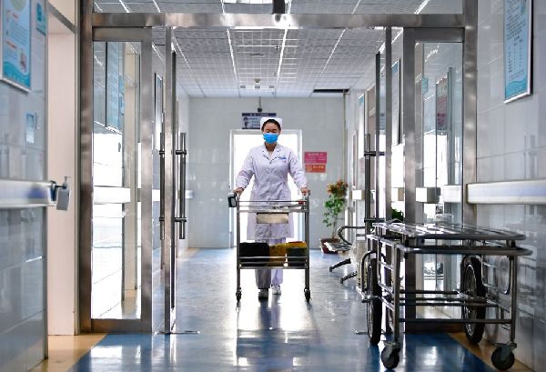 12月16日,海東市第一人民醫(yī)院內(nèi)科護士劉海婷在病房內(nèi)為患者拉開窗簾。