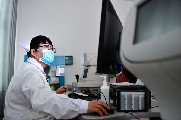 12月16日,海東市第二人民醫(yī)院眼科護士許國娟在給患者檢查眼睛。