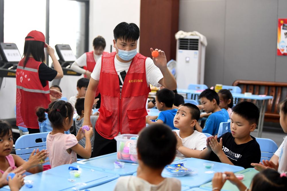 ??7月29日,在合肥市一六八中學安置點,志愿者帶小朋友做游戲。