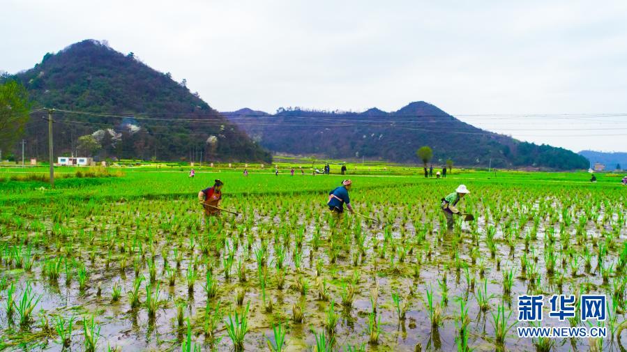 貴州省黔南布依族苗族自治州長順縣核子村村民在茭白地里松土(3月5日)。新華社發(fā)(蒯華揚(yáng) 攝)