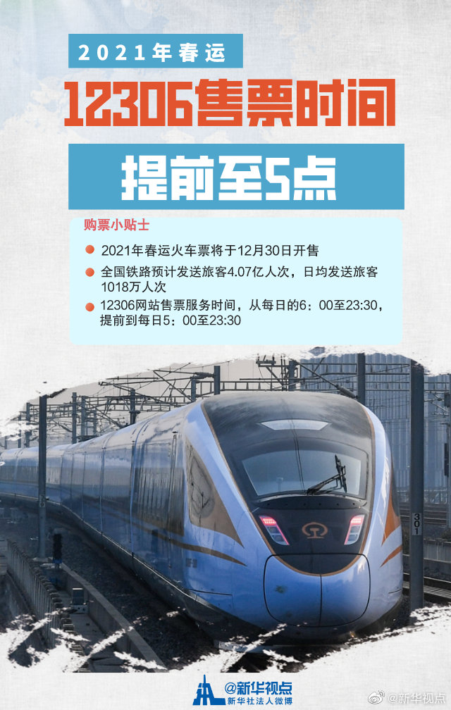 2021年鐵路春運(yùn)自1月28日開始,3月8日結(jié)束,共40天,全國鐵路預(yù)計(jì)發(fā)送旅客4.07億人次,日均發(fā)送旅客1018萬人次。據(jù)悉,鐵路部門將鐵路12306網(wǎng)站售票服務(wù)時(shí)間從每日的6:00至23:30,提前到每日5:00至23:30;同步12306網(wǎng)站和線下窗口改簽規(guī)則,線上也可改簽乘車當(dāng)日24點(diǎn)前其他列車車票。(記者樊曦、周圓)?