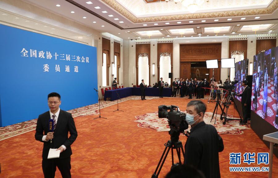 ??? 全國政協(xié)十三屆三次會(huì)議首場“委員通道”采訪活動(dòng)于5月21日在人民大會(huì)堂新聞發(fā)布廳舉行,邀請(qǐng)部分全國政協(xié)委員通過網(wǎng)絡(luò)視頻方式接受媒體采訪。圖為“委員通道”現(xiàn)場。新華網(wǎng) 王翰林 攝