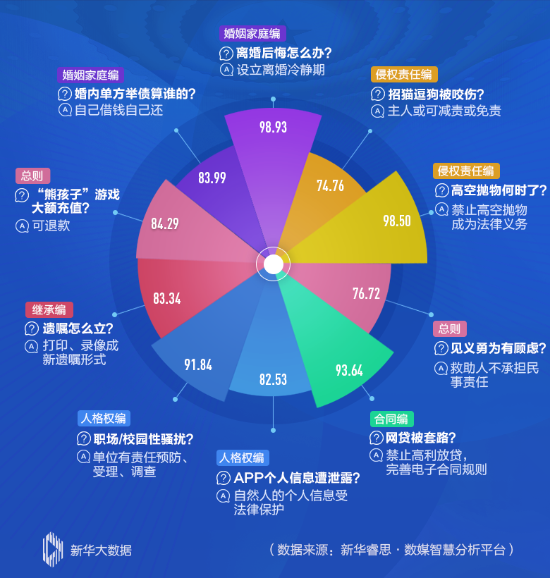 民法典草案1260個(gè)條文中,哪些最受關(guān)注?新華睿思數(shù)據(jù)顯示,最吸引人的話題為“離婚冷靜期”,網(wǎng)絡(luò)熱度值高達(dá)98.93,緊隨其后的,是與百姓日常生活緊密相關(guān)的“高空拋物”和涉及群眾“錢(qián)袋子”的“高利放貸”。