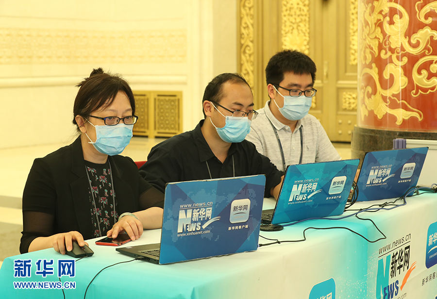 2020年5月28日下午十三屆全國(guó)人大三次會(huì)議閉幕后,國(guó)務(wù)院總理李克強(qiáng)在人民大會(huì)堂三樓金色大廳出席記者會(huì)并回答中外記者提問(wèn)。為有效防控疫情,共同維護(hù)公共衛(wèi)生與健康,記者會(huì)采用網(wǎng)絡(luò)視頻形式進(jìn)行。圖為新華網(wǎng)現(xiàn)場(chǎng)直播團(tuán)隊(duì)。 新華網(wǎng) 王翰林 攝