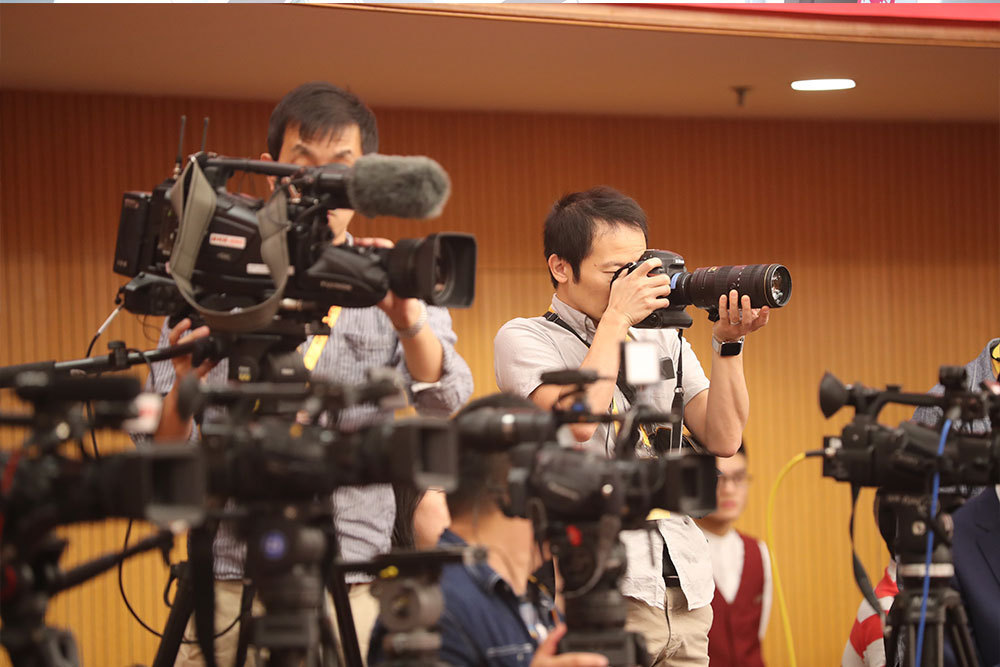 ???? 9月24日,慶祝中華人民共和國成立70周年活動新聞中心在北京梅地亞中心二層新聞發(fā)布廳舉辦第一場新聞發(fā)布會。圖為新聞發(fā)布會現(xiàn)場記者。新華網(wǎng)記者 陳競超 攝