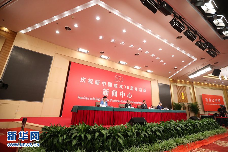 9月24日,慶祝中華人民共和國成立70周年活動新聞中心在北京梅地亞中心二層新聞發(fā)布廳舉辦第一場新聞發(fā)布會。圖為新聞發(fā)布會現(xiàn)場。新華網(wǎng)記者 陳競超 攝