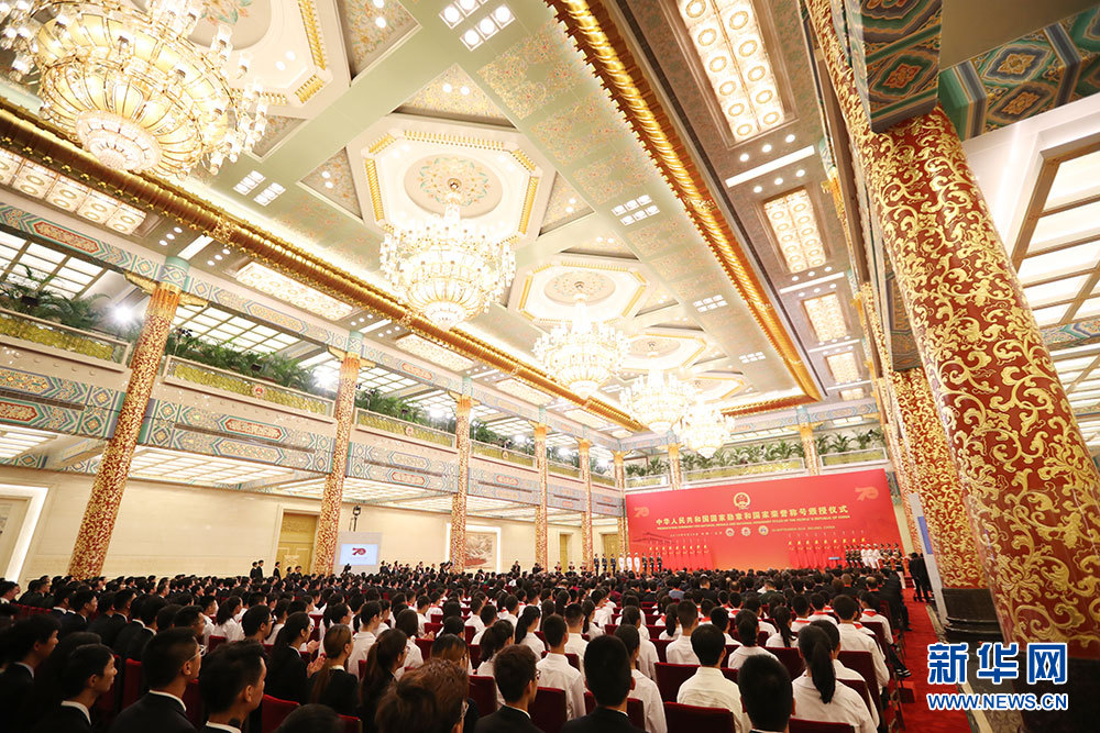 ??? 9月29日上午10時,中華人民共和國國家勛章和國家榮譽稱號頒授儀式在人民大會堂隆重舉行。圖為頒授儀式現(xiàn)場。新華網(wǎng) 陳杰 攝