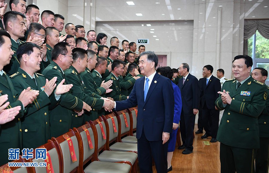 9月19日,中共中央政治局常委、全國政協(xié)主席、中央代表團(tuán)團(tuán)長汪洋率代表團(tuán)部分成員分別赴寧夏軍區(qū)、武警寧夏總隊慰問,并會見自治區(qū)政法系統(tǒng)代表。這是汪洋慰問武警寧夏總隊官兵代表。 新華社記者 張領(lǐng) 攝