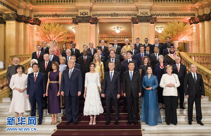 當?shù)貢r間11月30日,二十國集團領導人第十三次峰會在阿根廷布宜諾斯艾利斯舉行。當晚,國家主席習近平和夫人彭麗媛同出席峰會的各代表團團長夫婦集體合影。新華社記者 李學仁 攝