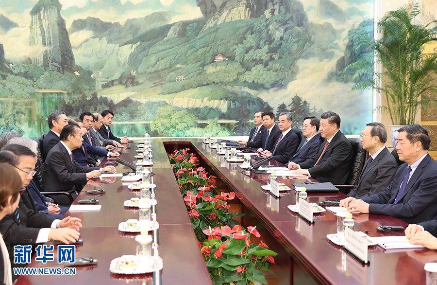 習近平指出,當前,中日關(guān)系重回正常軌道,呈現(xiàn)積極發(fā)展勢頭。雙方要恪守中日四個政治文件確立的各項原則,堅持和平友好大方向,持續(xù)深化互利合作,推動兩國關(guān)系健康穩(wěn)定發(fā)展。要把中日“互不構(gòu)成威脅”、“互為合作伙伴,相互支持對方和平發(fā)展”的政治共識落到實處,把兩國各領(lǐng)域交流合作推向新水平。雙方要深挖合作潛力。中方歡迎日方繼續(xù)深入?yún)⑴c中國改革開放,希望日方更加積極參與共建“一帶一路”。雙方要加強溝通和協(xié)調(diào),共同維護多邊主義和自由貿(mào)易,共同推動建設(shè)開放型世界經(jīng)濟。中方支持日方辦好二十國集團領(lǐng)導人大阪峰會。今年是中日青少年交流促進年,雙方要在兩國民間特別是青少年當中廣泛播撒友好種子,推進民心相通。