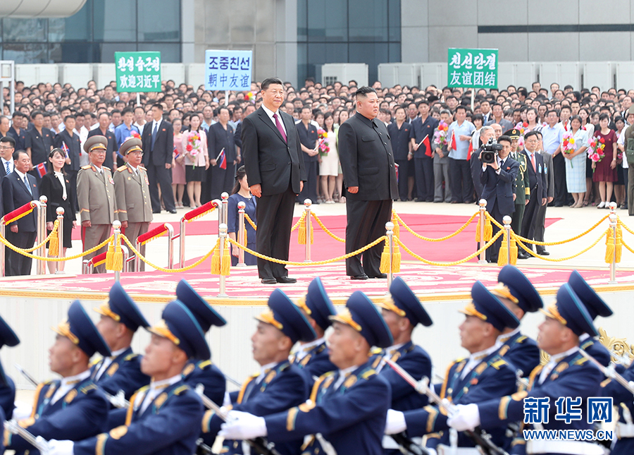 朝方在機(jī)場(chǎng)舉行隆重歡迎儀式。在21響禮炮聲中,軍樂(lè)隊(duì)奏中朝兩國(guó)國(guó)歌,習(xí)近平在金正恩陪同下檢閱了朝鮮人民軍三軍儀仗隊(duì),并觀看了分列式表演。