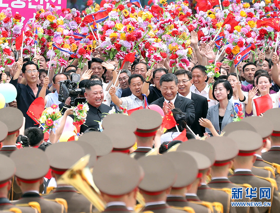 歡迎儀式結(jié)束后,在21輛禮賓摩托車的護(hù)衛(wèi)下,習(xí)近平乘車前往錦繡山迎賓館。沿途數(shù)十萬(wàn)群眾揮舞中朝兩國(guó)國(guó)旗和五彩繽紛的鮮花,熱情洋溢地高呼中朝友誼萬(wàn)歲等口號(hào),夾道歡迎。