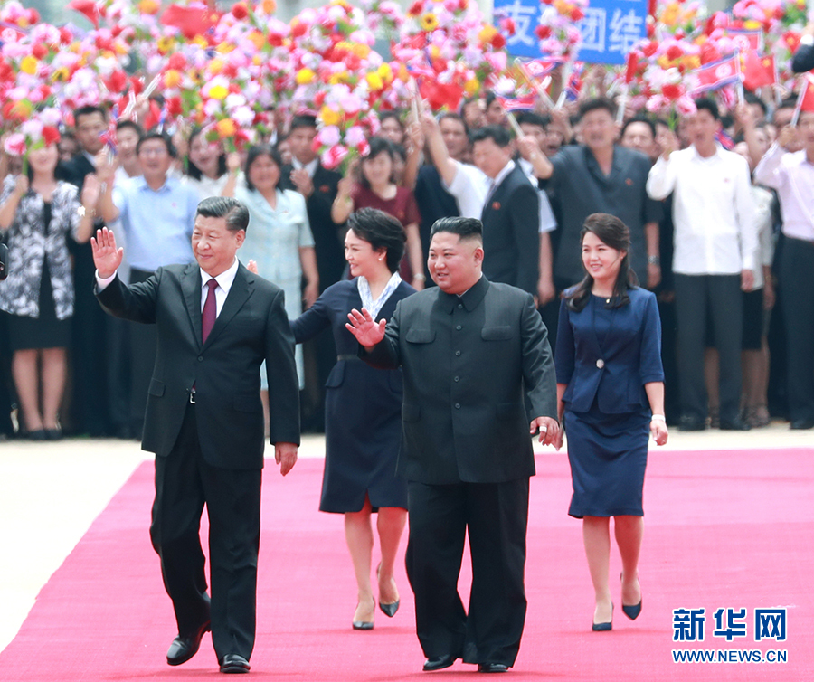 當(dāng)?shù)貢r(shí)間12時(shí)許,習(xí)近平乘坐的專機(jī)抵達(dá)平壤順安機(jī)場(chǎng)。雨后初晴的平壤,天高云淡、氣候怡人,到處郁郁蔥蔥、繁花似錦,整個(gè)城市洋溢著友好熱烈的氣氛。機(jī)場(chǎng)上中朝兩國(guó)國(guó)旗迎風(fēng)飄揚(yáng),“熱烈歡迎中國(guó)共產(chǎn)黨中央委員會(huì)總書記、中華人民共和國(guó)主席習(xí)近平同志”“鮮血凝成的朝中兩國(guó)人民之間牢不可破的友誼團(tuán)結(jié)萬(wàn)歲”大幅標(biāo)語(yǔ)高高懸掛,近萬(wàn)名群眾排列成整齊的隊(duì)伍,有力地?fù)]動(dòng)著花束,以歡快的口號(hào)和熱情的笑容,歡迎尊貴的中國(guó)客人到來(lái)。朝鮮勞動(dòng)黨委員長(zhǎng)、國(guó)務(wù)委員會(huì)委員長(zhǎng)金正恩和夫人李雪主到機(jī)場(chǎng)迎接。