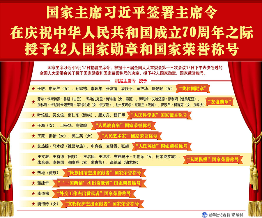 新華社北京9月17日電? 國(guó)家主席習(xí)近平17日簽署主席令,根據(jù)十三屆全國(guó)人大常委會(huì)第十三次會(huì)議17日下午表決通過(guò)的全國(guó)人大常委會(huì)關(guān)于授予國(guó)家勛章和國(guó)家榮譽(yù)稱號(hào)的決定,授予42人國(guó)家勛章、國(guó)家榮譽(yù)稱號(hào)。