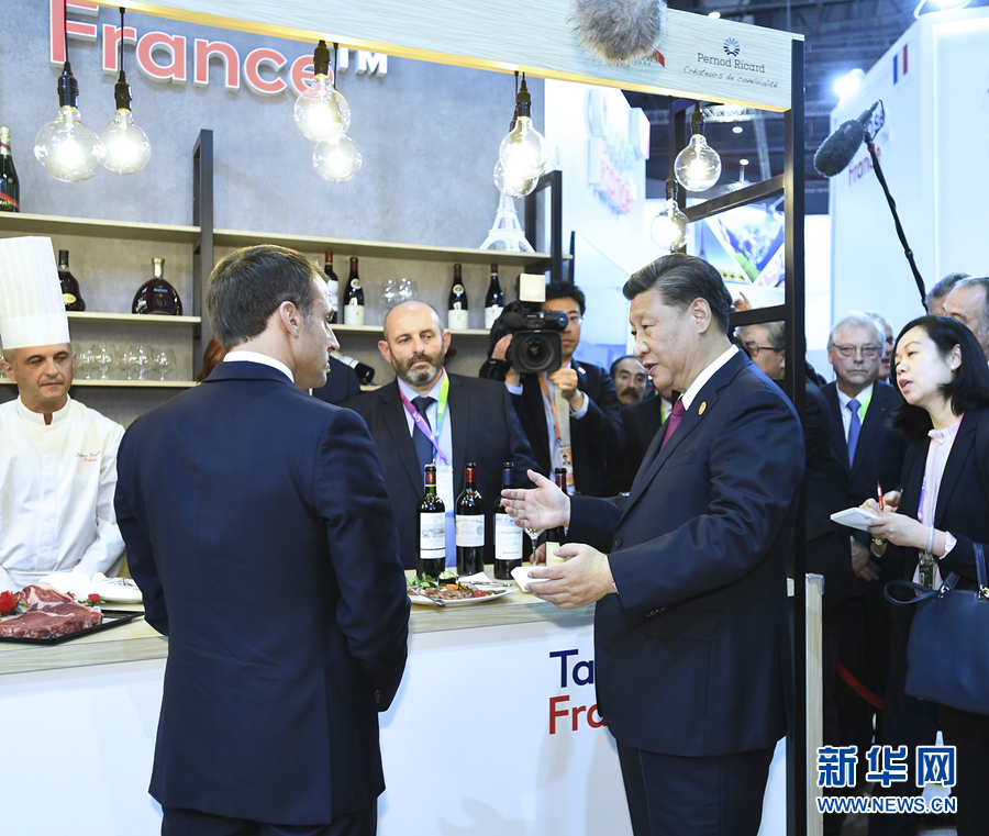 習(xí)近平在法國總統(tǒng)馬克龍陪同下首先來到法國館。馬克龍熱情邀請習(xí)近平品嘗法國紅酒和牛肉食品。在場法國企業(yè)家爭先恐后向習(xí)近平表示,法國企業(yè)看好中國市場,希望進一步擴大對華出口。習(xí)近平指出,中國消費市場很大,可以滿足不同層次的多樣化需求,希望法國企業(yè)家展現(xiàn)長遠眼光,同中國加強互利合作。