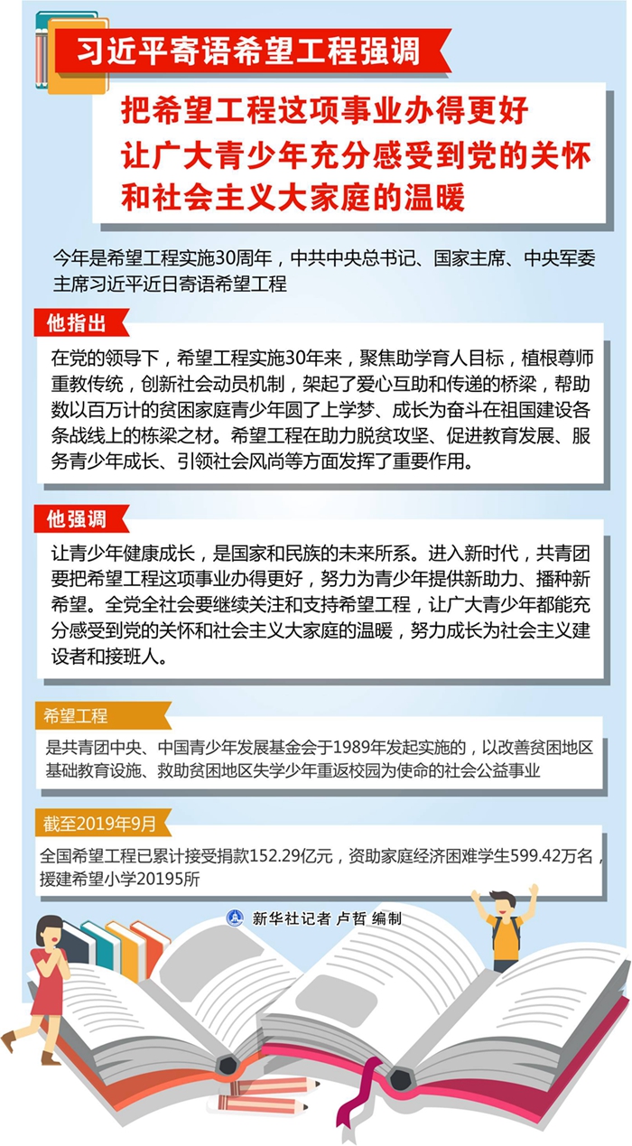 習(xí)近平強(qiáng)調(diào),讓青少年健康成長(zhǎng),是國家和民族的未來所系。進(jìn)入新時(shí)代,共青團(tuán)要把希望工程這項(xiàng)事業(yè)辦得更好,努力為青少年提供新助力、播種新希望。全黨全社會(huì)要繼續(xù)關(guān)注和支持希望工程,讓廣大青少年都能充分感受到黨的關(guān)懷和社會(huì)主義大家庭的溫暖,努力成長(zhǎng)為社會(huì)主義建設(shè)者和接班人。