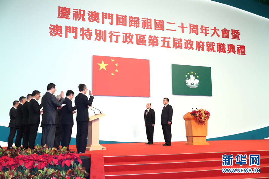 12月20日,慶祝澳門回歸祖國(guó)20周年大會(huì)暨澳門特別行政區(qū)第五屆政府就職典禮在澳門東亞運(yùn)動(dòng)會(huì)體育館隆重舉行。中共中央總書記、國(guó)家主席、中央軍委主席習(xí)近平出席并發(fā)表重要講話。由習(xí)近平監(jiān)誓,澳門特別行政區(qū)第五屆政府主要官員在澳門特區(qū)第五任行政長(zhǎng)官賀一誠(chéng)帶領(lǐng)下宣誓就職。 新華社記者 鞠鵬 攝