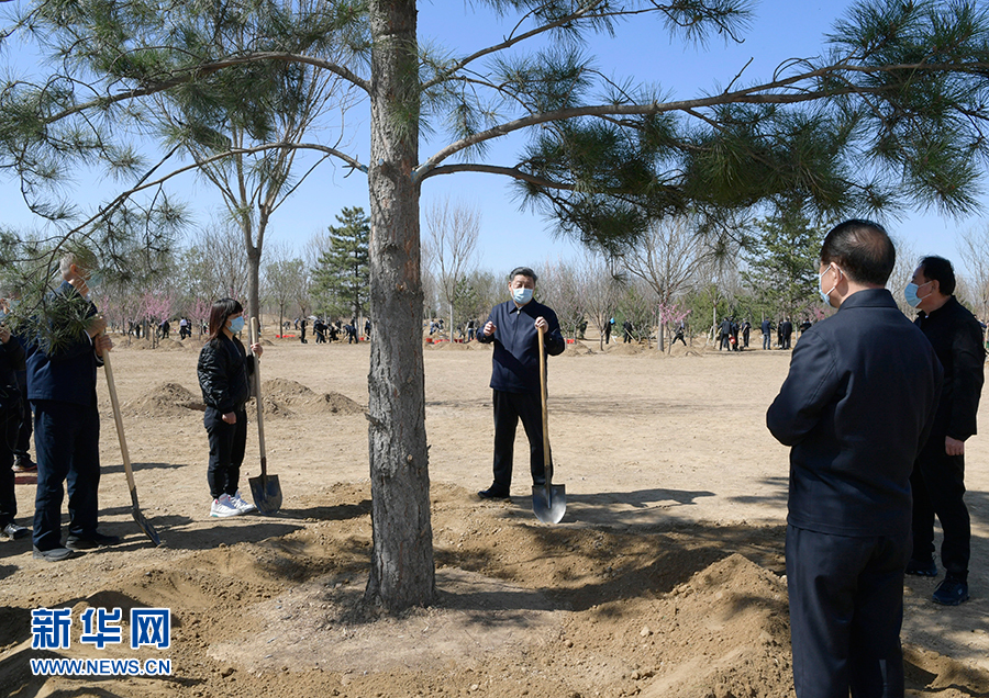 揮鍬鏟土、培土圍堰、提水澆灌……習近平接連種下油松、國槐、杏梅、元寶楓、西府海棠、金銀木、紅瑞木。在和煦的春風中,挺拔的樹苗錯落有致,鮮艷的花朵迎風招展,初綻的枝葉格外清新。植樹現(xiàn)場一片繁忙景象。參加勞動的領導同志同大家一起培土澆水,氣氛熱烈。
