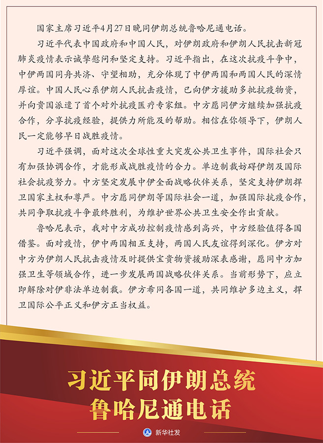 習(xí)近平代表中國政府和中國人民,對伊朗政府和伊朗人民抗擊新冠肺炎疫情表示誠摯慰問和堅(jiān)定支持。習(xí)近平指出,在這次抗疫斗爭中,中伊兩國同舟共濟(jì)、守望相助,充分體現(xiàn)了中伊兩國和兩國人民的深情厚誼。中國人民心系伊朗人民抗擊疫情,已向伊方援助多批抗疫物資,并向貴國派遣了首個對外抗疫醫(yī)療專家組。中方愿同伊方繼續(xù)加強(qiáng)抗疫合作,分享抗疫經(jīng)驗(yàn),提供力所能及的幫助。相信在你領(lǐng)導(dǎo)下,伊朗人民一定能夠早日戰(zhàn)勝疫情。