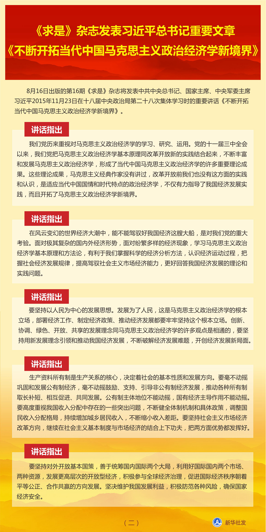 新華社北京8月15日電 8月16日出版的第16期《求是》雜志將發(fā)表中共中央總書記、國家主席、中央軍委主席習近平2015年11月23日在十八屆中央政治局第二十八次集體學習時的重要講話《不斷開拓當代中國馬克思主義政治經濟學新境界》。