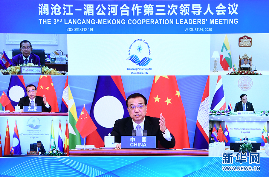 8月24日,國(guó)務(wù)院總理李克強(qiáng)在北京人民大會(huì)堂出席瀾滄江-湄公河合作第三次領(lǐng)導(dǎo)人視頻會(huì)議。李克強(qiáng)和老撾總理通倫共同主持會(huì)議。柬埔寨首相洪森、緬甸總統(tǒng)溫敏、泰國(guó)總理巴育、越南總理阮春福出席。 新華社記者 饒愛(ài)民 攝