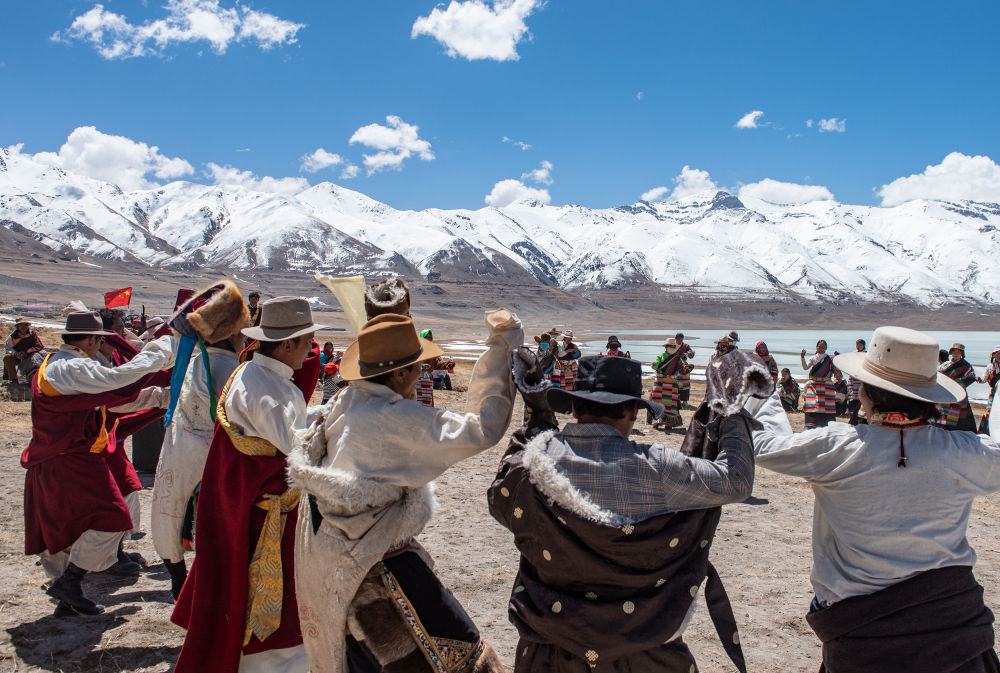 雪域高原上,村民們?cè)诖焊涠Y上跳鍋莊舞(4月30日攝)。新華社記者 田金文 攝