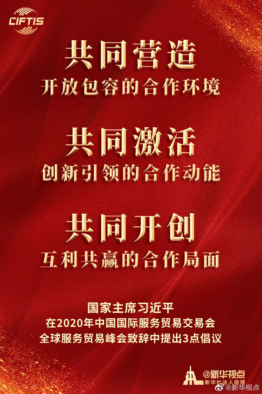 國家主席習(xí)近平在2020年中國國際服務(wù)貿(mào)易交易會全球服務(wù)貿(mào)易峰會上發(fā)表視頻致辭時就服務(wù)業(yè)開放合作提出3點倡議:共同營造開放包容的合作環(huán)境;共同激活創(chuàng)新引領(lǐng)的合作動能;共同開創(chuàng)互利共贏的合作局面。?