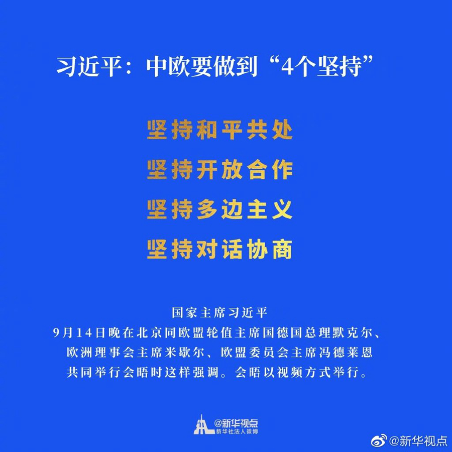 國家主席習(xí)近平9月14日晚在北京同歐盟輪值主席國德國總理默克爾、歐洲理事會主席米歇爾、歐盟委員會主席馮德萊恩共同舉行會晤,會晤以視頻方式舉行。