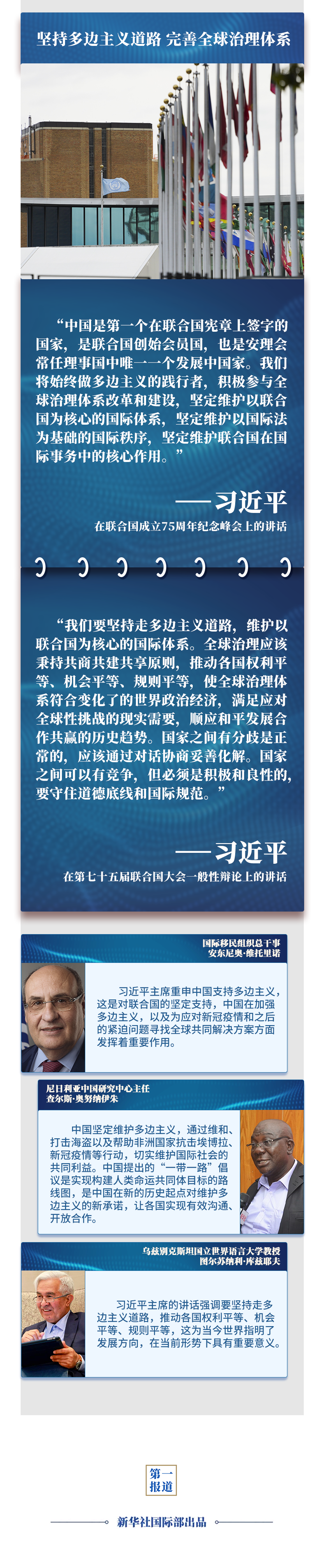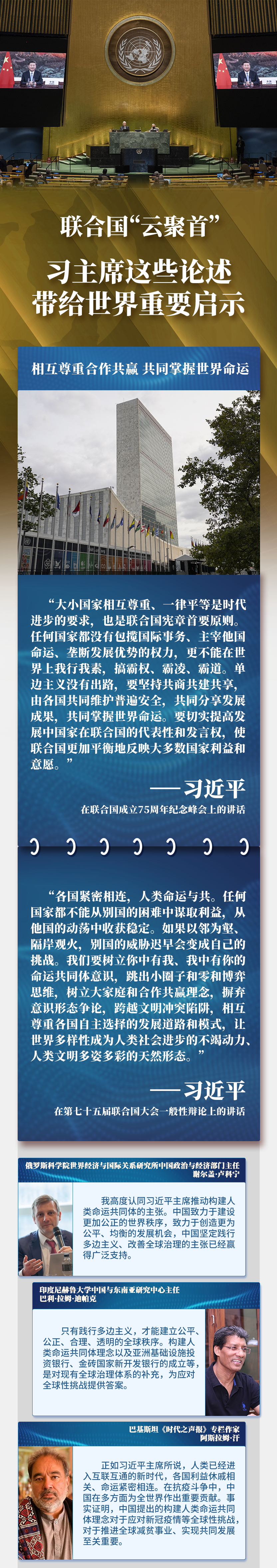 在聯(lián)合國成立75周年之際,習(xí)主席通過視頻方式,在聯(lián)合國這一多邊外交舞臺闡述關(guān)于國際秩序和人類前途命運的中國主張,為國際社會應(yīng)對全球性挑戰(zhàn)、推動共同發(fā)展指明方向,為世界各國攜手構(gòu)建人類命運共同體、共創(chuàng)更加美好的未來注入信心和動力——