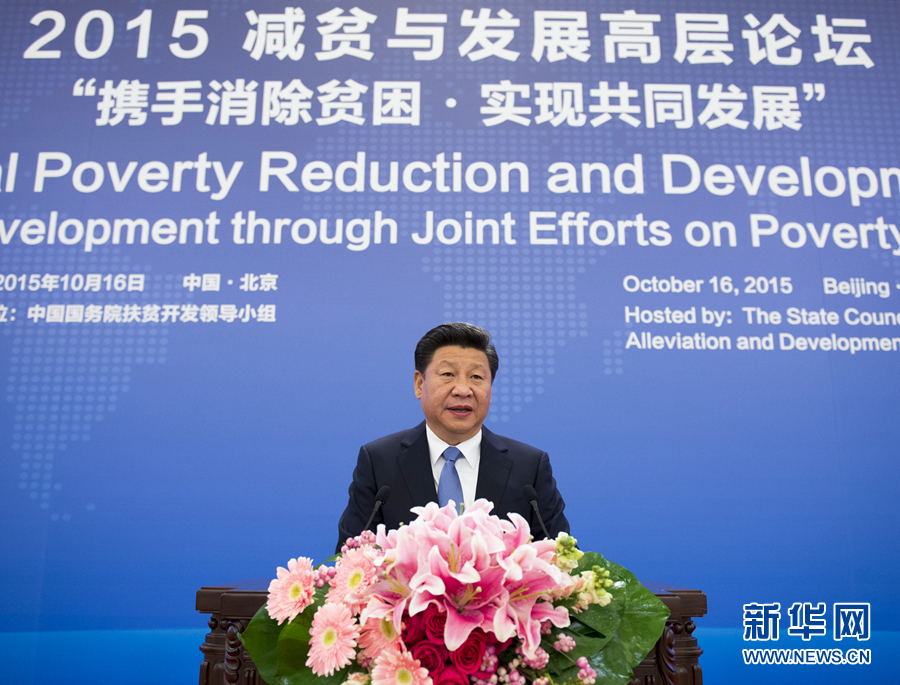 2015年10月16日,習近平在北京出席2015減貧與發(fā)展高層論壇并發(fā)表題為《攜手消除貧困 促進共同發(fā)展》的主旨演講,強調消除貧困是人類的共同使命。改革開放30多年來,中國走出了一條中國特色減貧道路。中國在致力于自身消除貧困的同時,積極展開南南合作,同舟共濟,攻堅克難,支持和幫助廣大發(fā)展中國家特別是最不發(fā)達國家消除貧困,為各國人民帶來更多福祉。 新華社記者 李學仁 攝