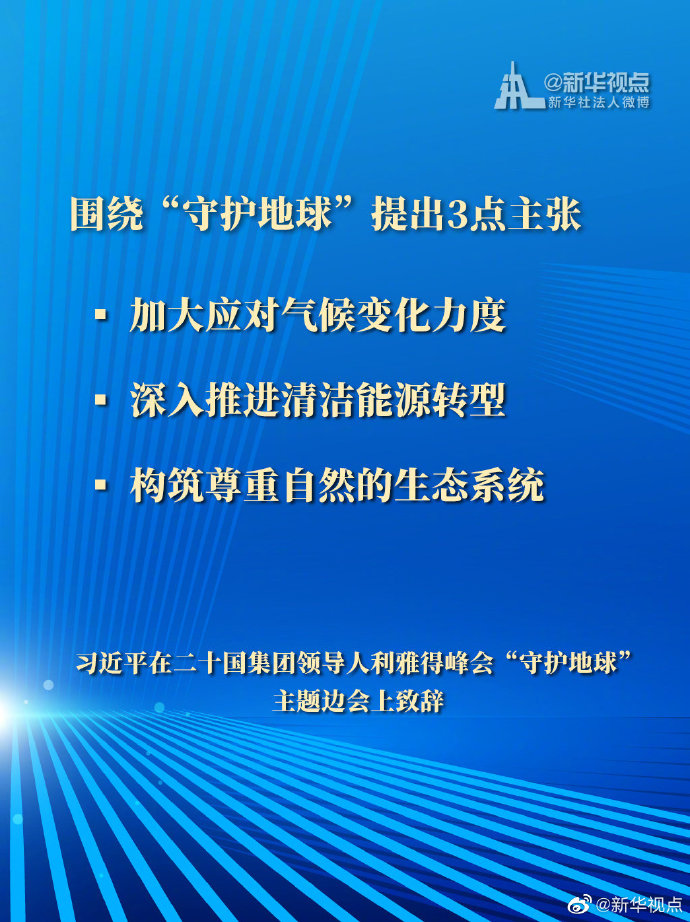 國(guó)家主席習(xí)近平11月22日在二十國(guó)集團(tuán)領(lǐng)導(dǎo)人利雅得峰會(huì)“守護(hù)地球”主題邊會(huì)上提出3點(diǎn)主張。