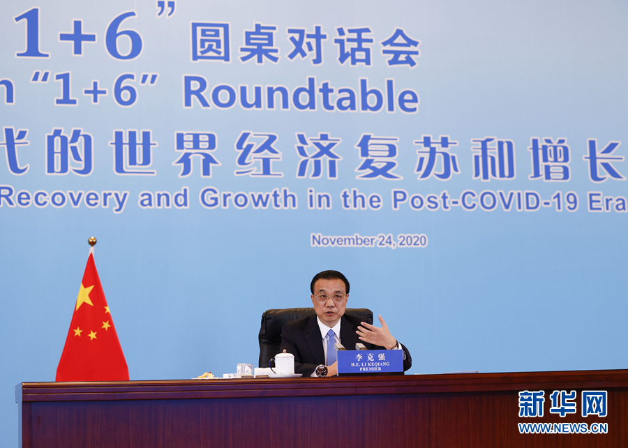 11月24日晚,國務(wù)院總理李克強在北京釣魚臺國賓館同世界銀行行長馬爾帕斯、國際貨幣基金組織總裁格奧爾基耶娃、世界貿(mào)易組織副總干事沃爾夫、國際勞工組織總干事賴德、經(jīng)濟合作與發(fā)展組織秘書長古里亞和金融穩(wěn)定理事會主席夸爾斯舉行第五次“1+6”圓桌對話會。會議以視頻方式舉行。新華社記者 黃敬文 攝