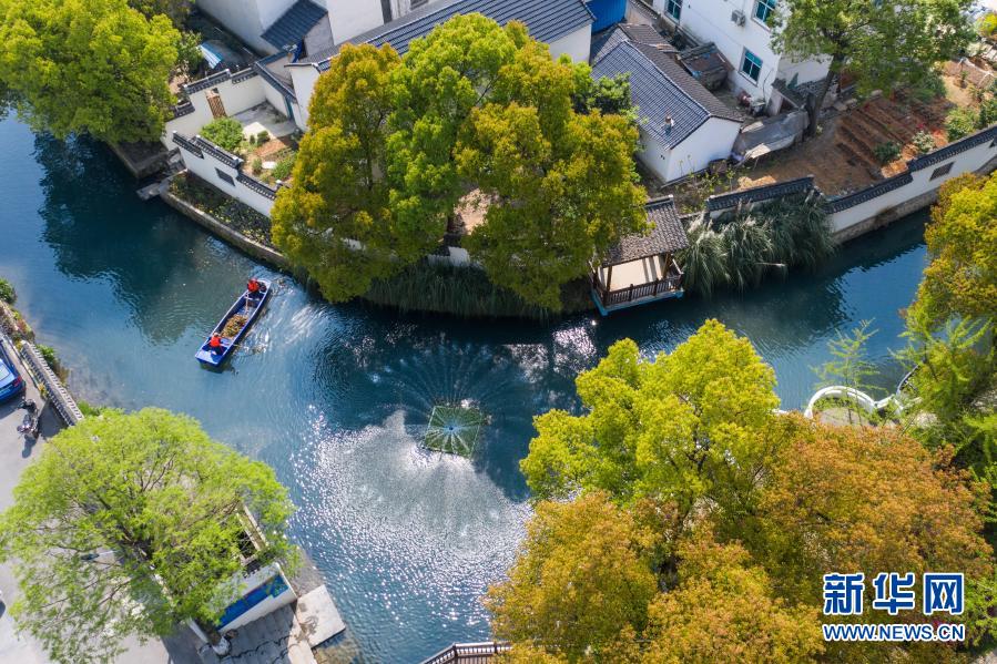 浙江省長興縣龍山街道渚山村,保潔人員進(jìn)行日常河道護(hù)理巡查(4月9日攝,無人機照片)。新華社記者 徐昱 攝