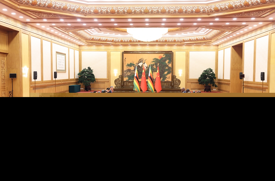 9月4日上午,国家主席习近平在北京人民大会堂会见来华出席纪念中国人民抗日战争暨世界反法西斯战争胜利80周年活动的津巴布韦总统姆南加古瓦。两国元首宣布将双边关系提升为中津全天候命运共同体。新华社记者 刘卫兵 摄