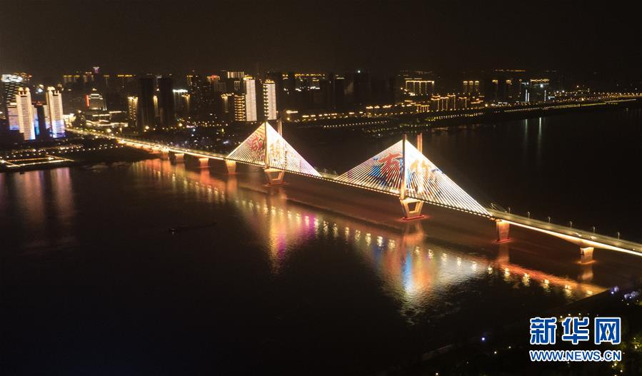 4月8日零時起,武漢市正式解除離漢離鄂通道管控措施,全市景觀照明開啟(無人機照片)。新華社記者 程敏 攝