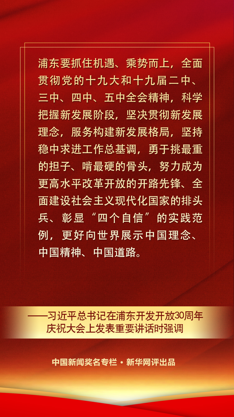對(duì)歷史的最好回望,就是創(chuàng)造新的歷史。而立之年的浦東,正站在奮力打造新時(shí)代改革開(kāi)放新高地的新起點(diǎn),處處彰顯著勃勃生機(jī)和無(wú)限活力。要全力做強(qiáng)創(chuàng)新引擎,打造自主創(chuàng)新新高地;加強(qiáng)改革系統(tǒng)集成,激活高質(zhì)量發(fā)展新動(dòng)力;深入推進(jìn)高水平制度型開(kāi)放,增創(chuàng)國(guó)際合作和競(jìng)爭(zhēng)新優(yōu)勢(shì);增強(qiáng)全球資源配置能力,服務(wù)構(gòu)建新發(fā)展格局;提高城市治理現(xiàn)代化水平,開(kāi)創(chuàng)人民城市建設(shè)新局面……進(jìn)入新時(shí)代,以習(xí)近平同志為核心的黨中央繼續(xù)對(duì)浦東開(kāi)發(fā)開(kāi)放提出明確要求,把一系列國(guó)家戰(zhàn)略任務(wù)放在浦東,推動(dòng)浦東開(kāi)發(fā)開(kāi)放不斷展現(xiàn)新氣象。新時(shí)代再出發(fā),浦東要發(fā)揚(yáng)敢拼敢闖的勁頭,勇于挑最重的擔(dān)子、啃最硬的骨頭,努力成為更高水平改革開(kāi)放的開(kāi)路先鋒、全面建設(shè)社會(huì)主義現(xiàn)代化國(guó)家的排頭兵、彰顯“四個(gè)自信”的實(shí)踐范例,更好向世界展示中國(guó)理念、中國(guó)精神、中國(guó)道路。