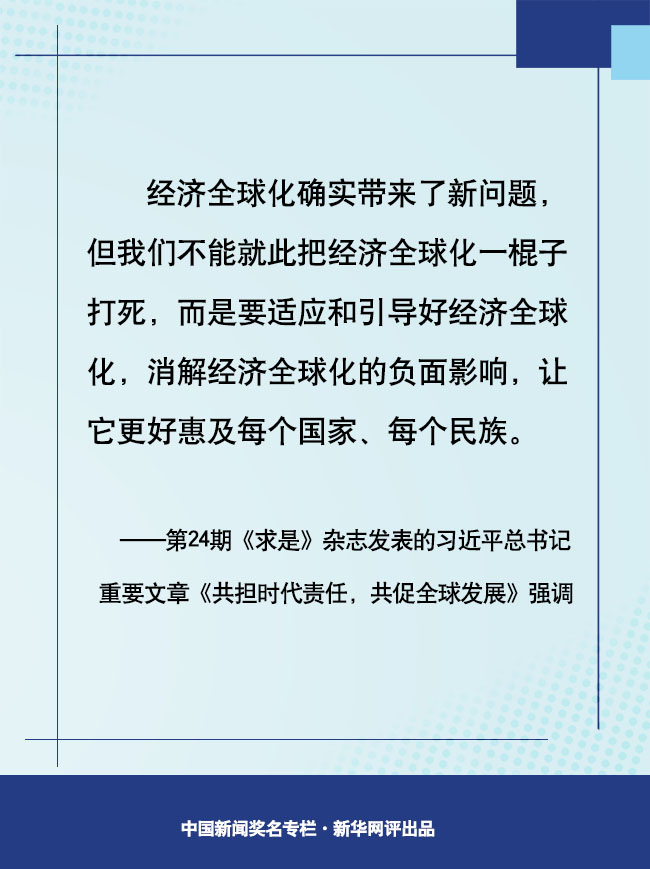12月16日出版的第24期《求是》雜志,發(fā)表中共中央總書記、國(guó)家主席、中央軍委主席習(xí)近平的重要文章《共擔(dān)時(shí)代責(zé)任,共促全球發(fā)展》。文章深刻洞察經(jīng)濟(jì)全球化的歷史大勢(shì),深刻分析世界經(jīng)濟(jì)發(fā)展面臨的共同難題,呼吁國(guó)際社會(huì)以合作應(yīng)對(duì)挑戰(zhàn),適應(yīng)和引導(dǎo)好經(jīng)濟(jì)全球化。