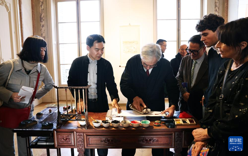 12月20日,在法国巴黎中国文化中心,嘉宾在“心境映象——荣宝斋当代艺术展暨木版水印特展”上体验木版水印制作技艺。