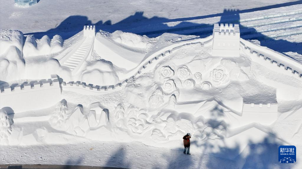 12月23日,一名游客在第37届太阳岛国际雪雕艺术博览会上拍照留念。