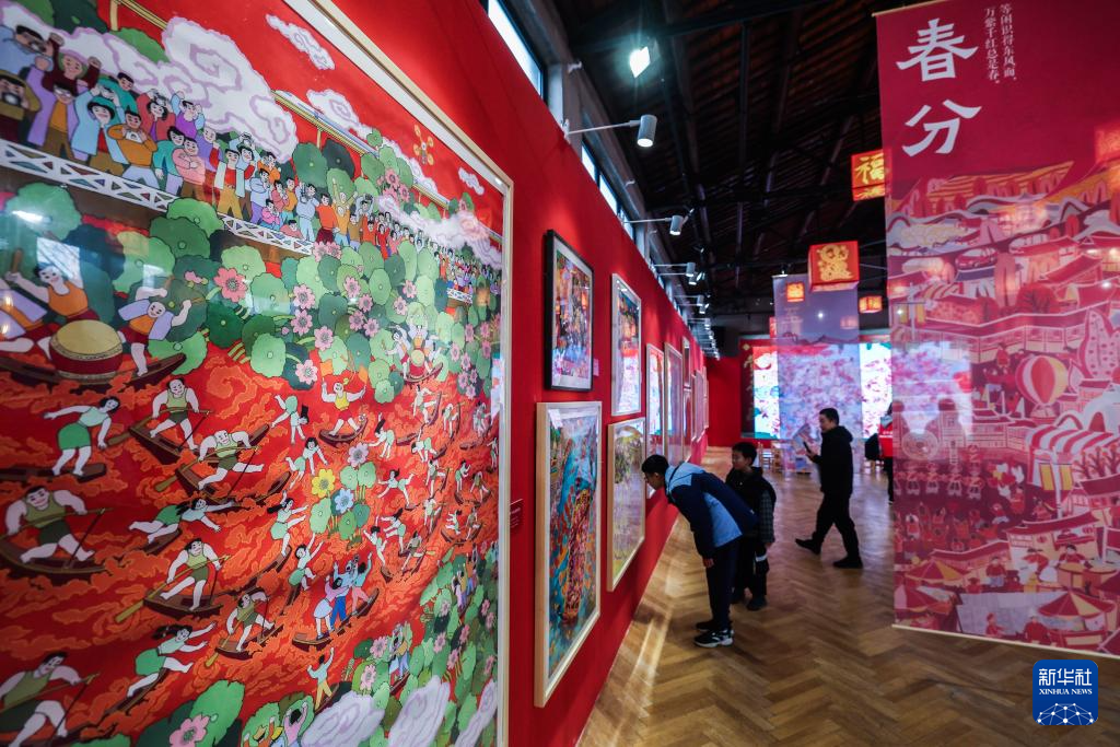 1月23日,游客在湖州吴兴的小西街西岸美术馆观赏年画美术作品。