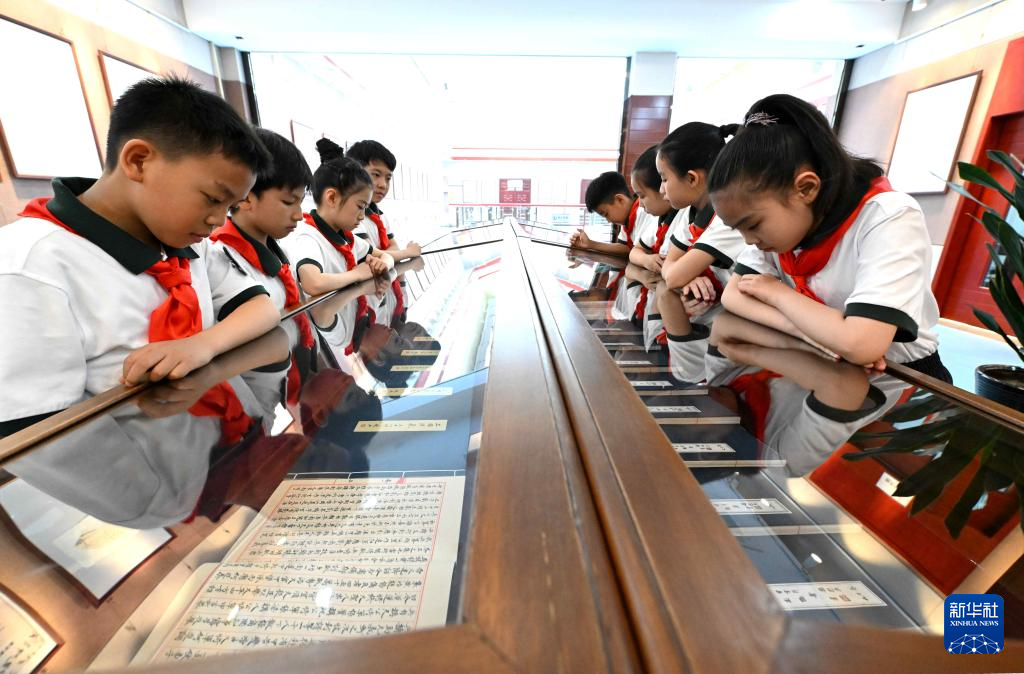 4月21日,石家庄市实验小学学生在石家庄市图书馆参观手抄中国名著展览。