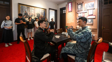 8月18日,来自广州的游客在泉州市蟳埔村出租“簪花围”的服饰店里参观。